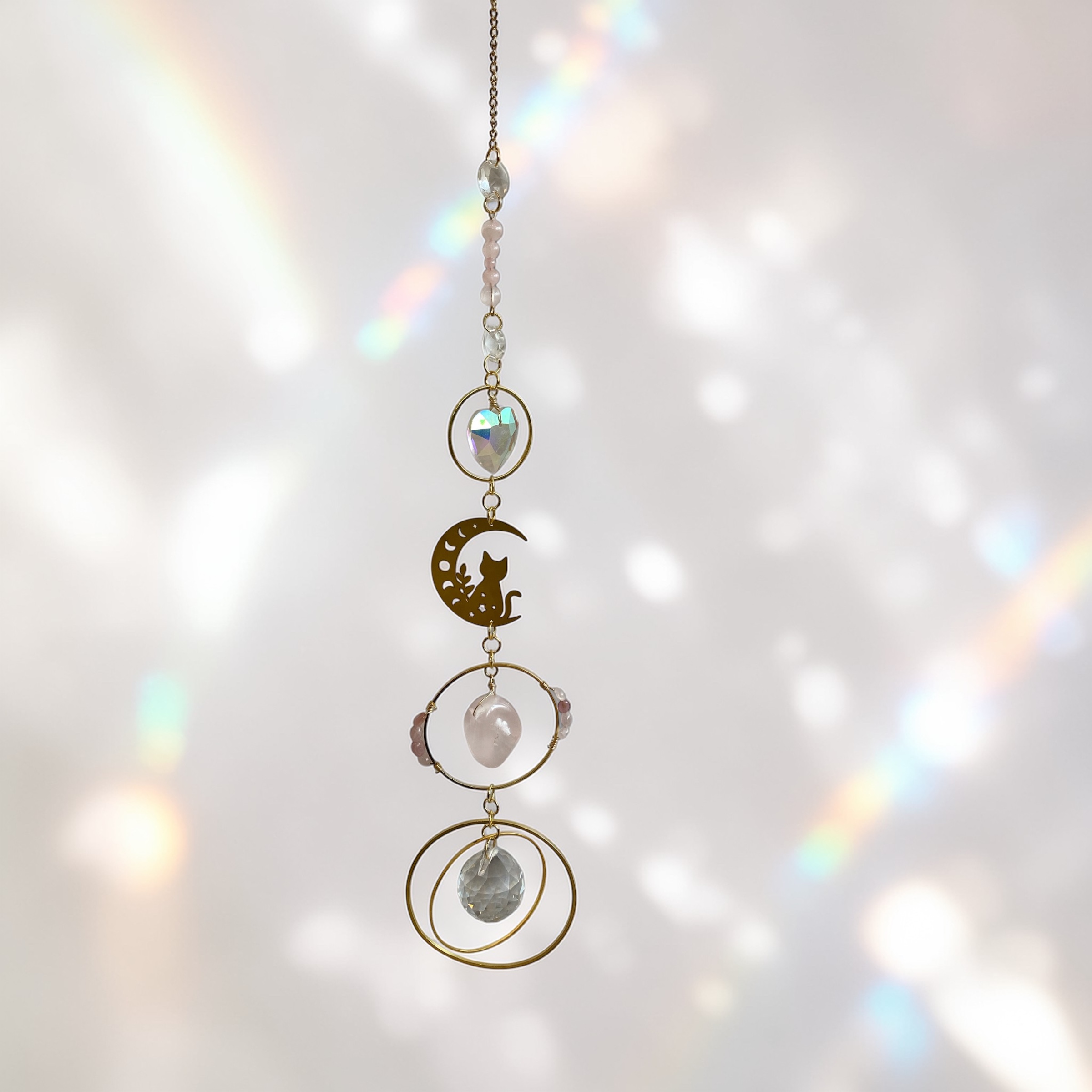 Réalisé entièrement à la main dans mon atelier, cet attrape-soleil associe un délicat motif de lune accompagné d’un petit chat à des pierres de quartz rose, connues pour symboliser l’amour, la tendresse et l’apaisement émotionnel.