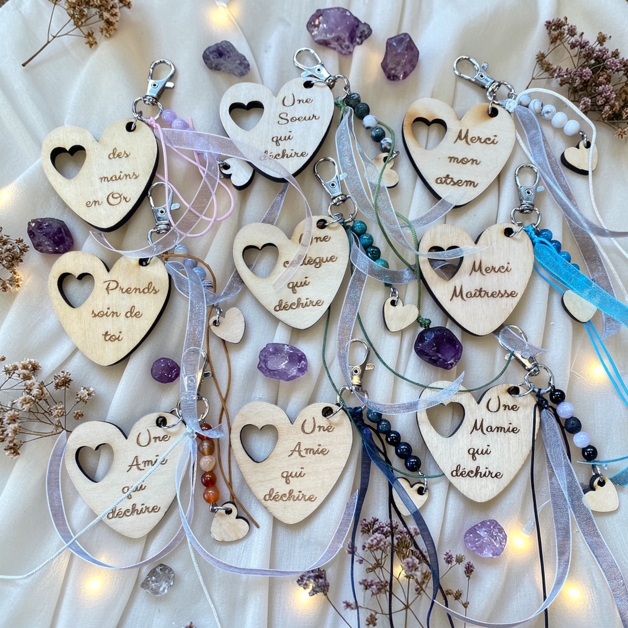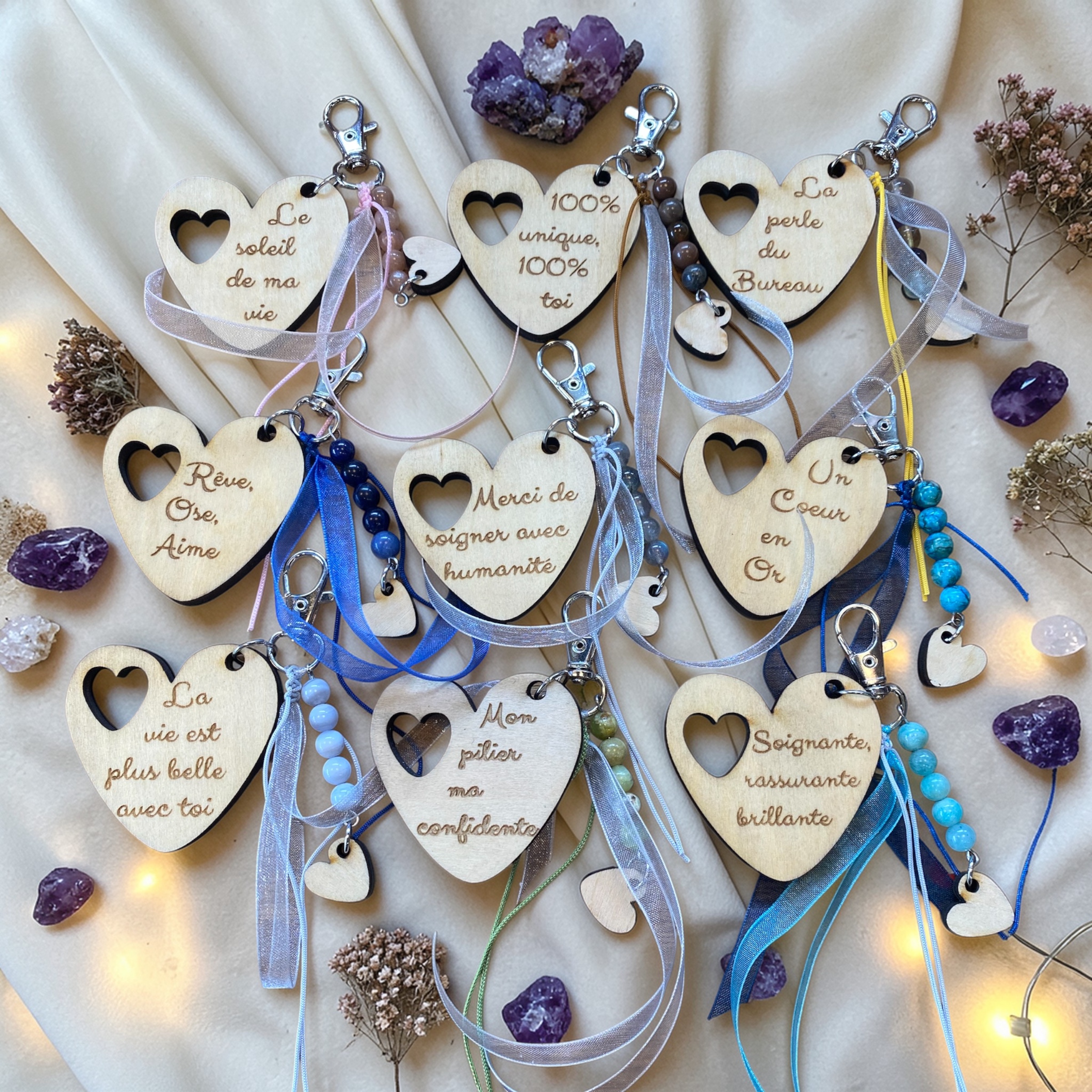 Chaque bijou de sac est réalisé à la commande, ce qui en fait une pièce unique, idéale pour offrir ou se faire plaisir. Les petites variations du bois et des pierres naturelles rendent chaque création encore plus authentique.