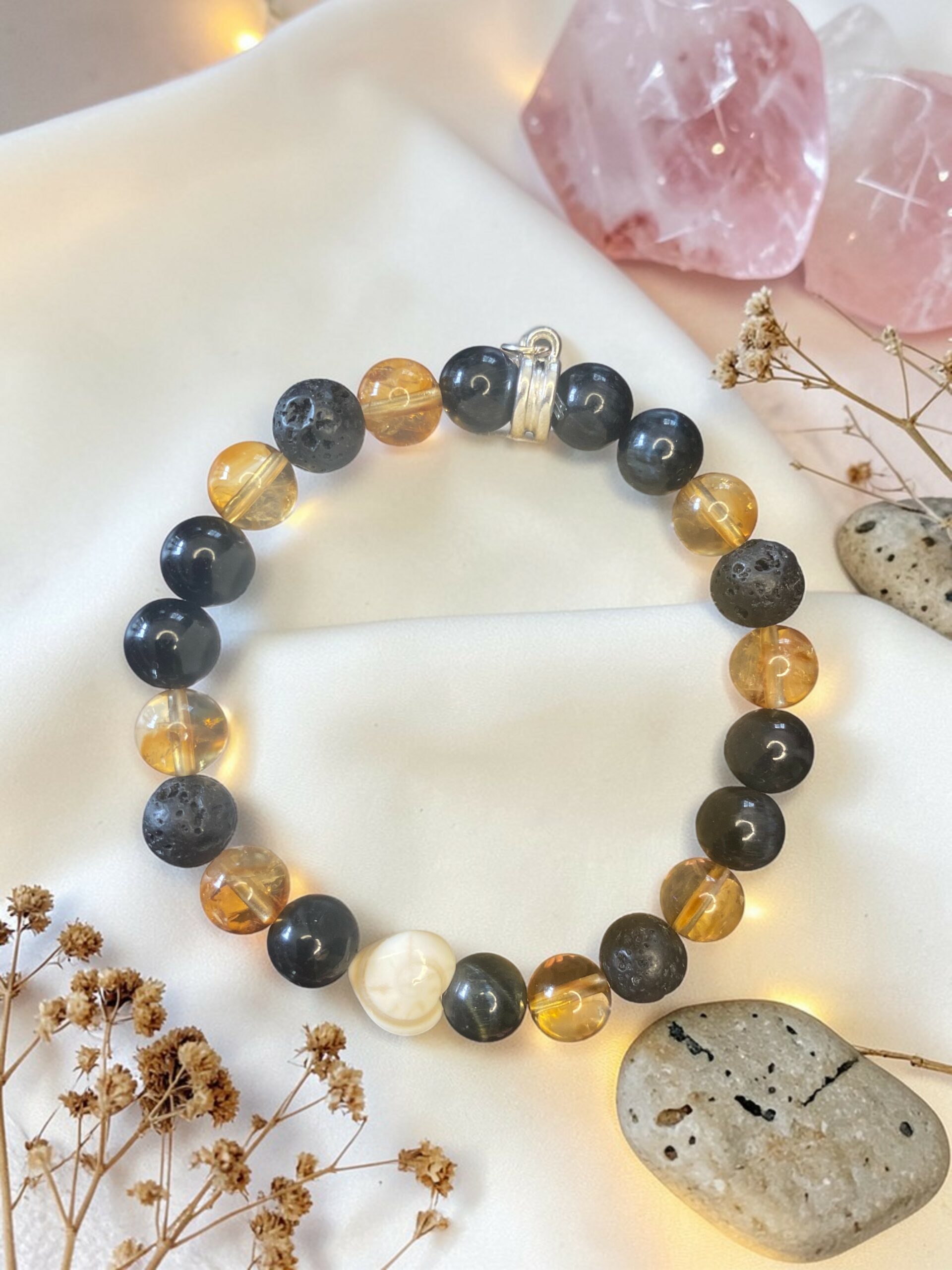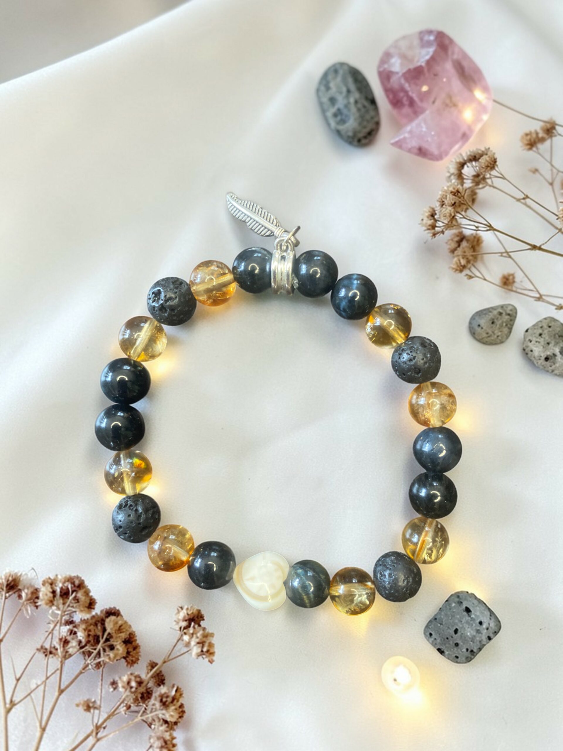 Le bracelet changements est constitué uniquement de pierres naturelles de citrine, œil de faucon et pierre de Lave. J’ai rajouté un œil de sainte Lucie en forme de cœur pour éloigner le mauvais œil et porter chance.