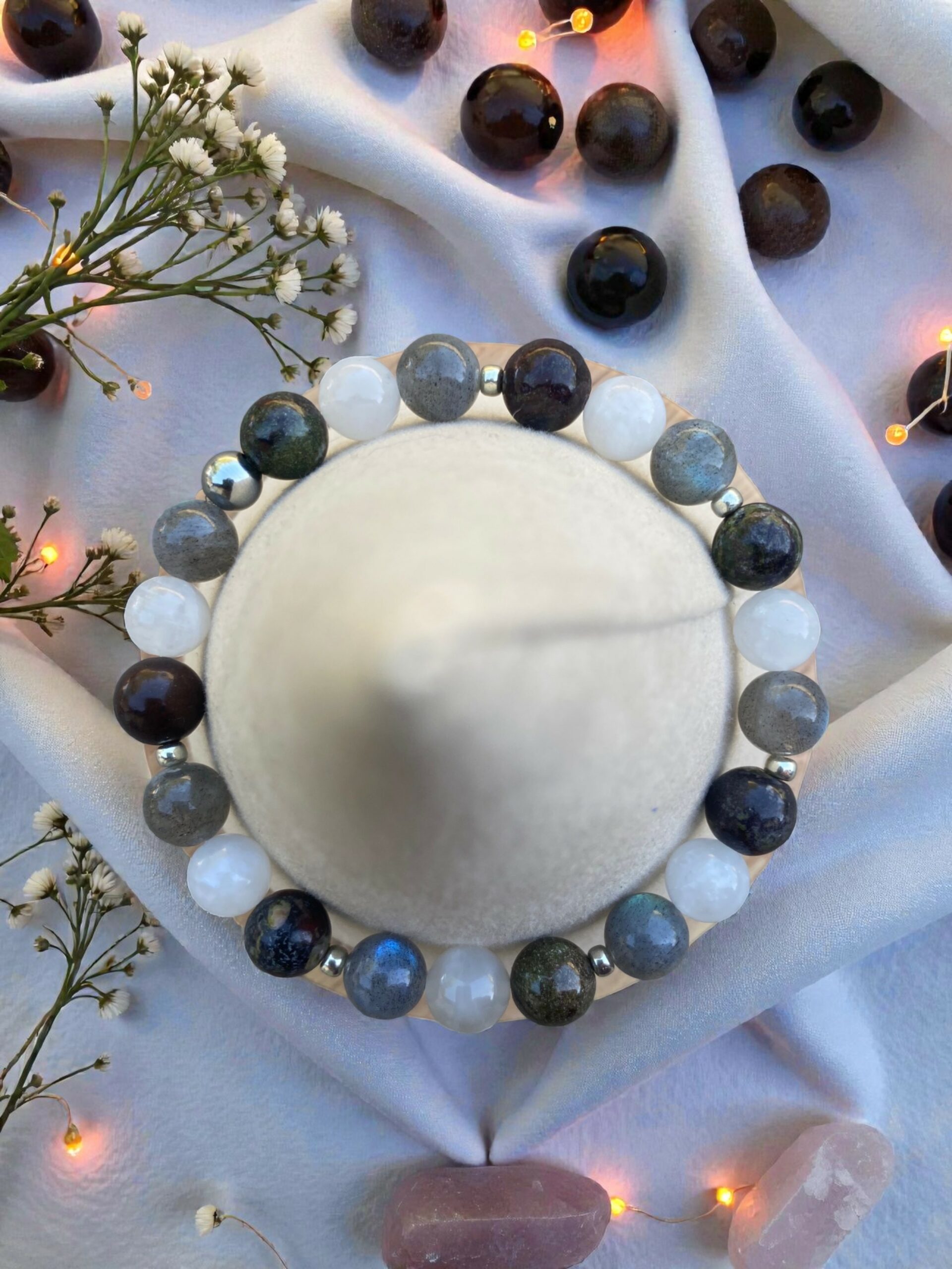 Le bracelet Chemin Intérieur est un talisman pour celles et ceux qui souhaitent rester connectés à leur sagesse intérieure tout en gardant les pieds bien ancrés. Il unit trois pierres aux vibrations profondes : la jaspe sanguine pour la force vitale, la labradorite pour l’intuition et la protection, et la pierre de lune pour la guidance et l’écoute de soi.