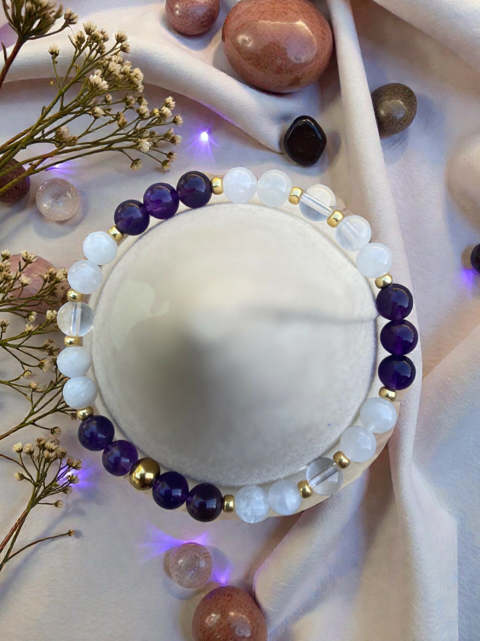 • Améthyste : ouverture du troisième œil, apaisement mental, lien au spirituel.