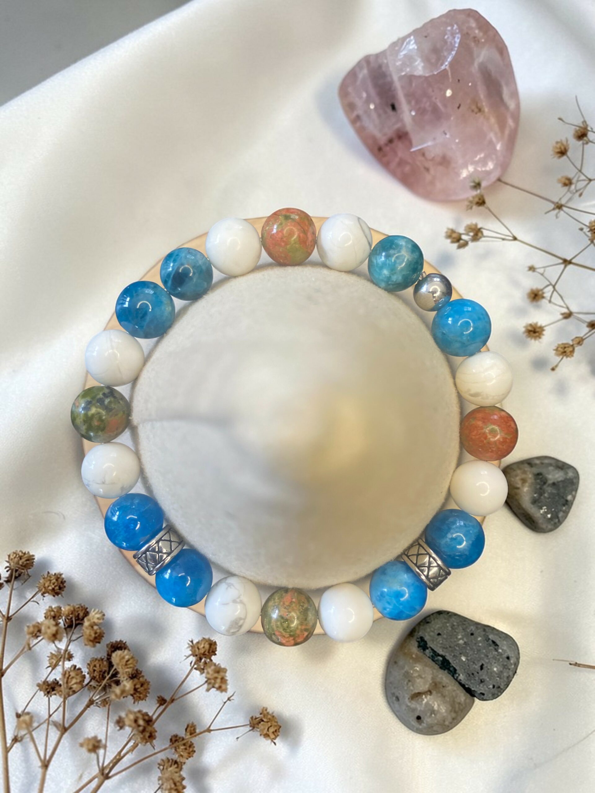 Composé de Howlite, unakite et apatite, il réunit trois énergies complémentaires pour accompagner celles qui souhaitent rester alignées entre leurs émotions, leurs pensées et leur intuition.