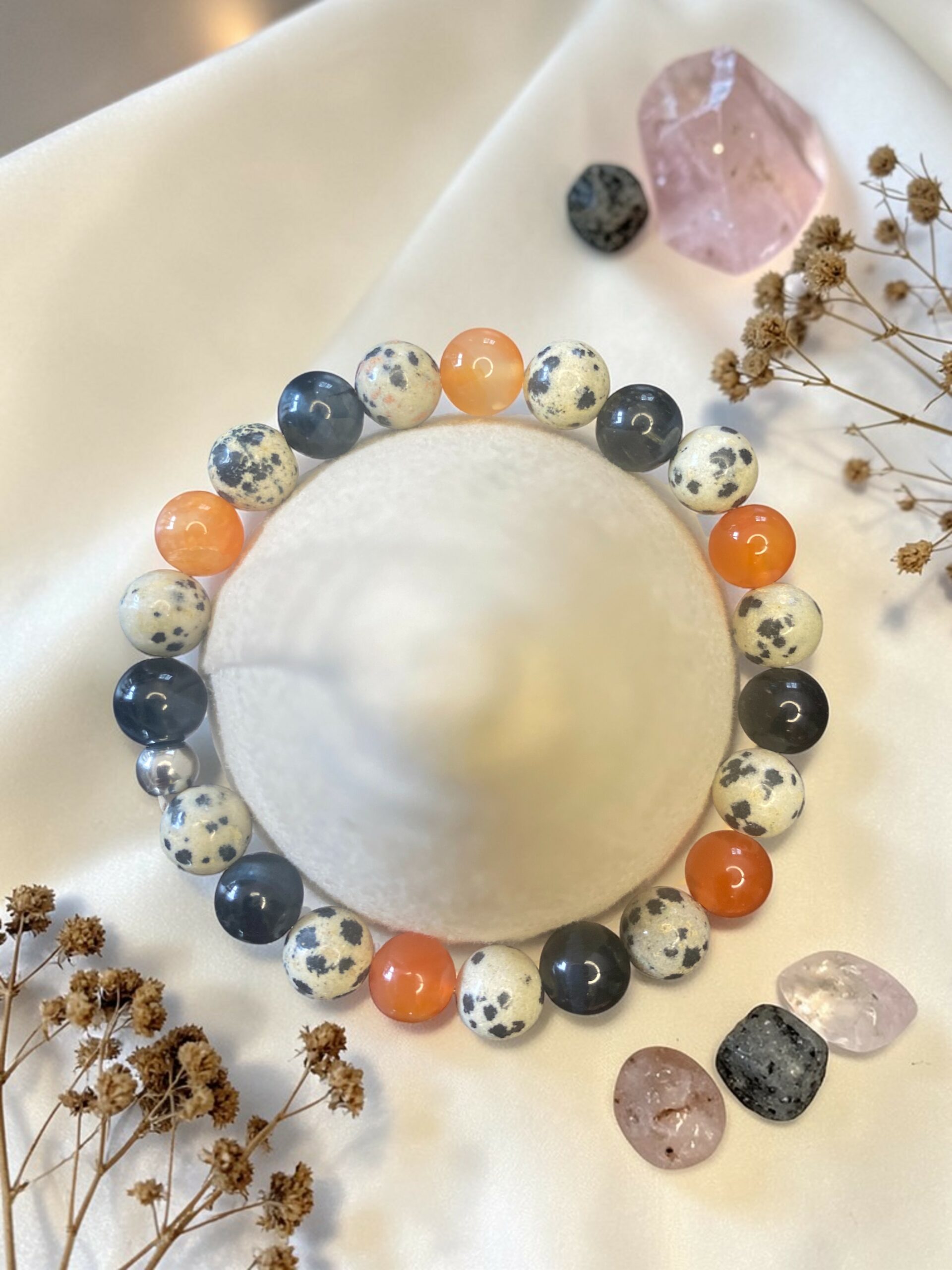 Le Bracelet l’audacieuse est réalisé à la main avec passion et bienveillance et monté sur un cordon élastique.