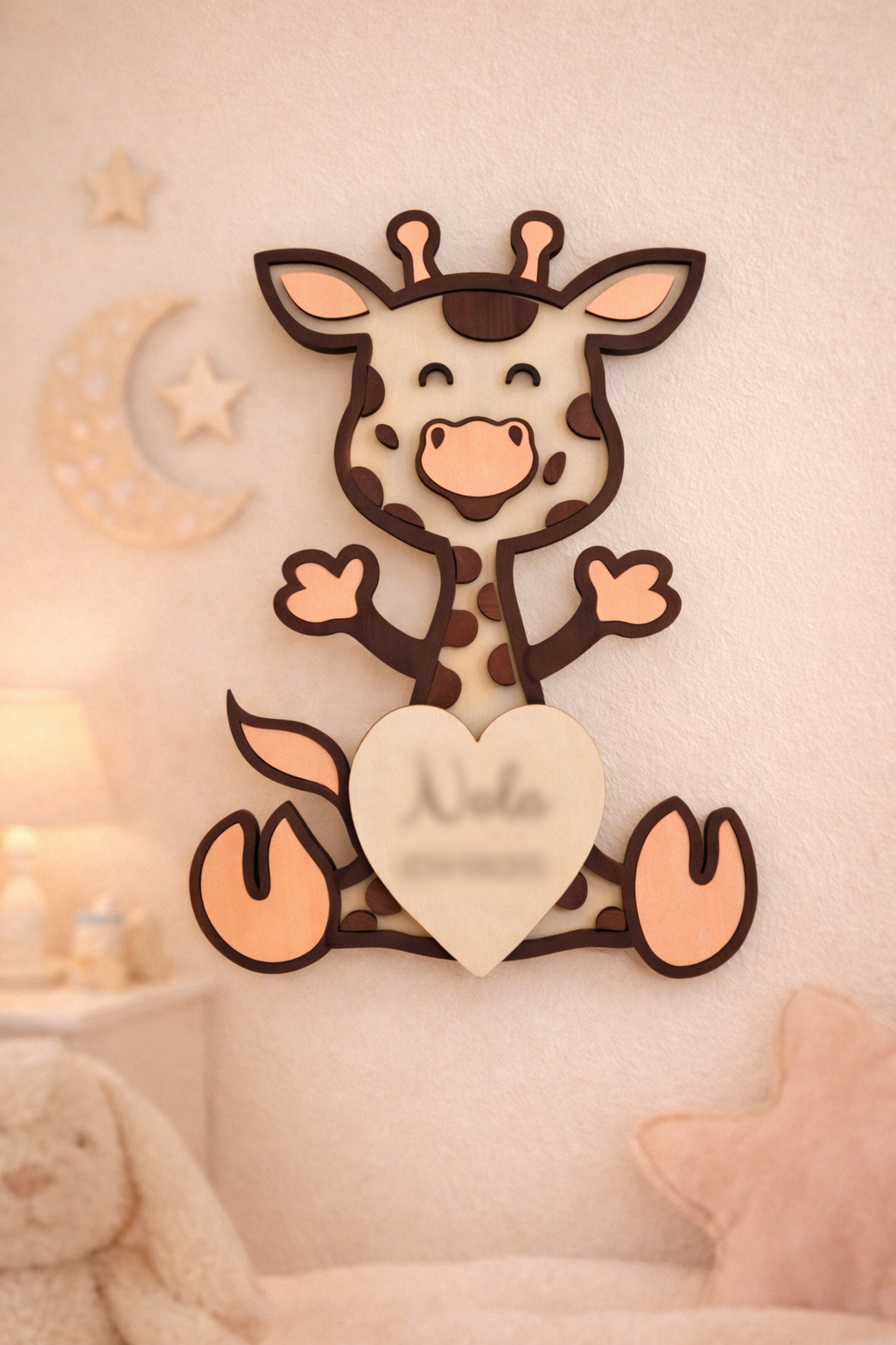 Ajoutez une touche poétique et originale à votre liste de naissance avec cette girafe personnalisée en bois, un objet durable, fait main, et 100% personnalisable.