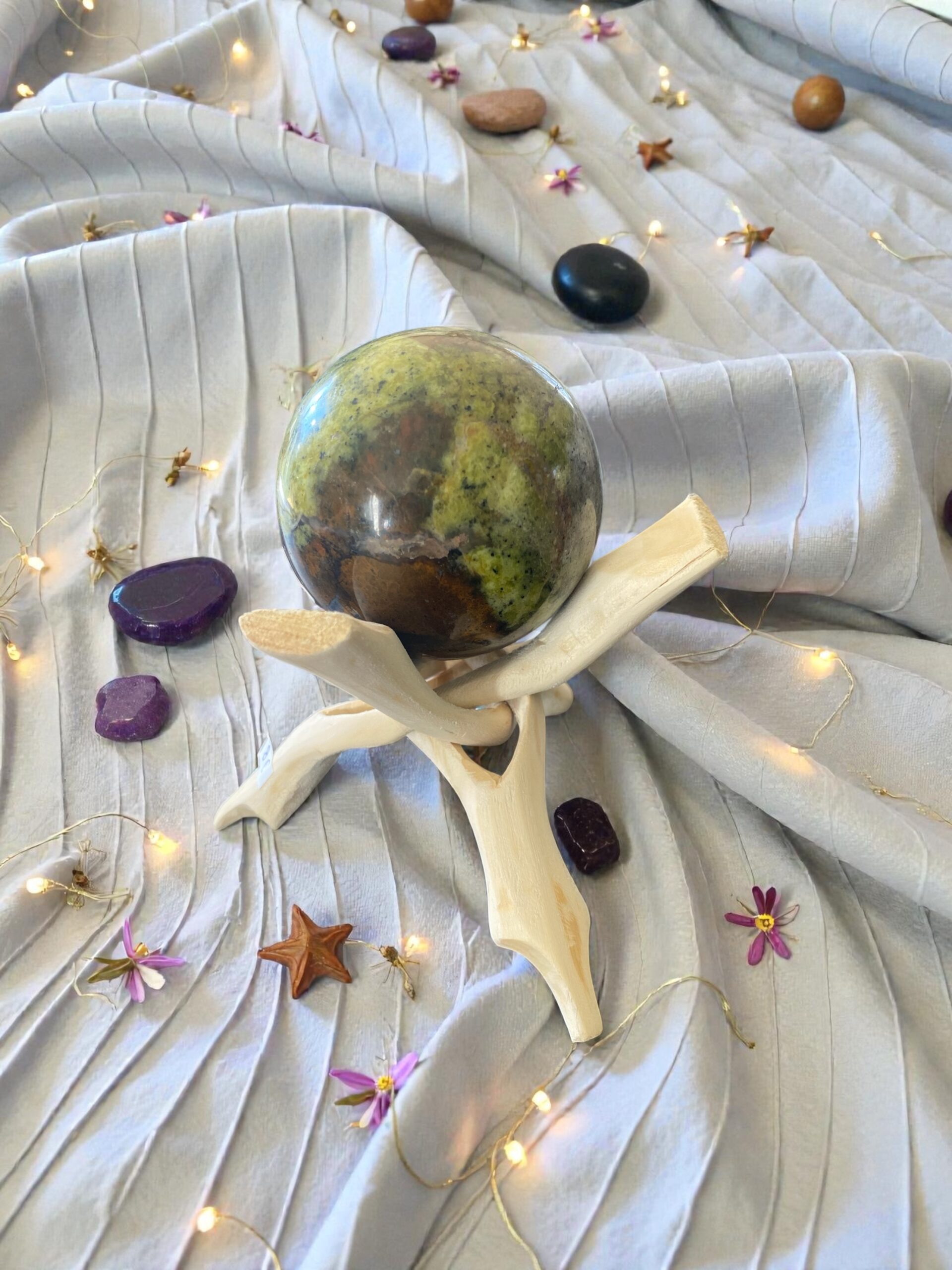 Chaque sphère est unique, façonnée dans une pierre naturelle, avec ses nuances, ses veines, ses vibrations propres. Elle devient à la fois un objet décoratif fort, un élément énergétique subtil et une présence minérale vivante dans l’espace.
